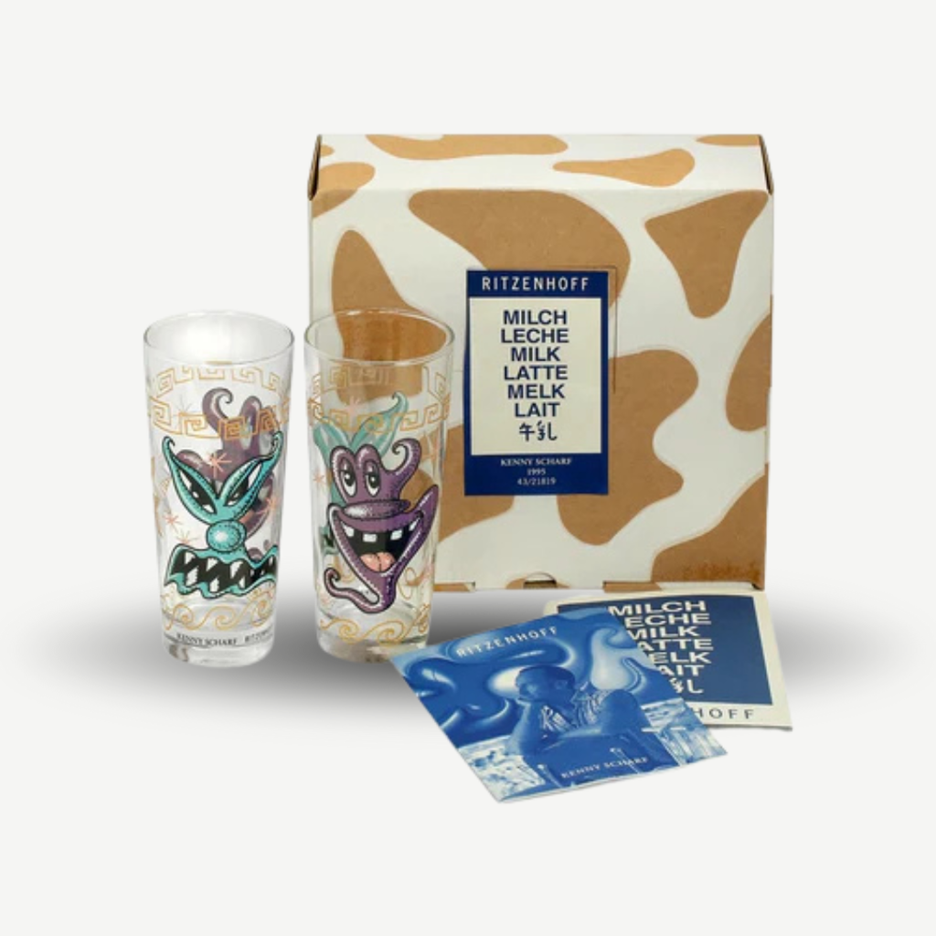 Boxed set of two milk glasses designed by artist Kenny Scharf, comes with a pamphlet about the artist. Each glass measures 6" high by 2 1/2" wide.