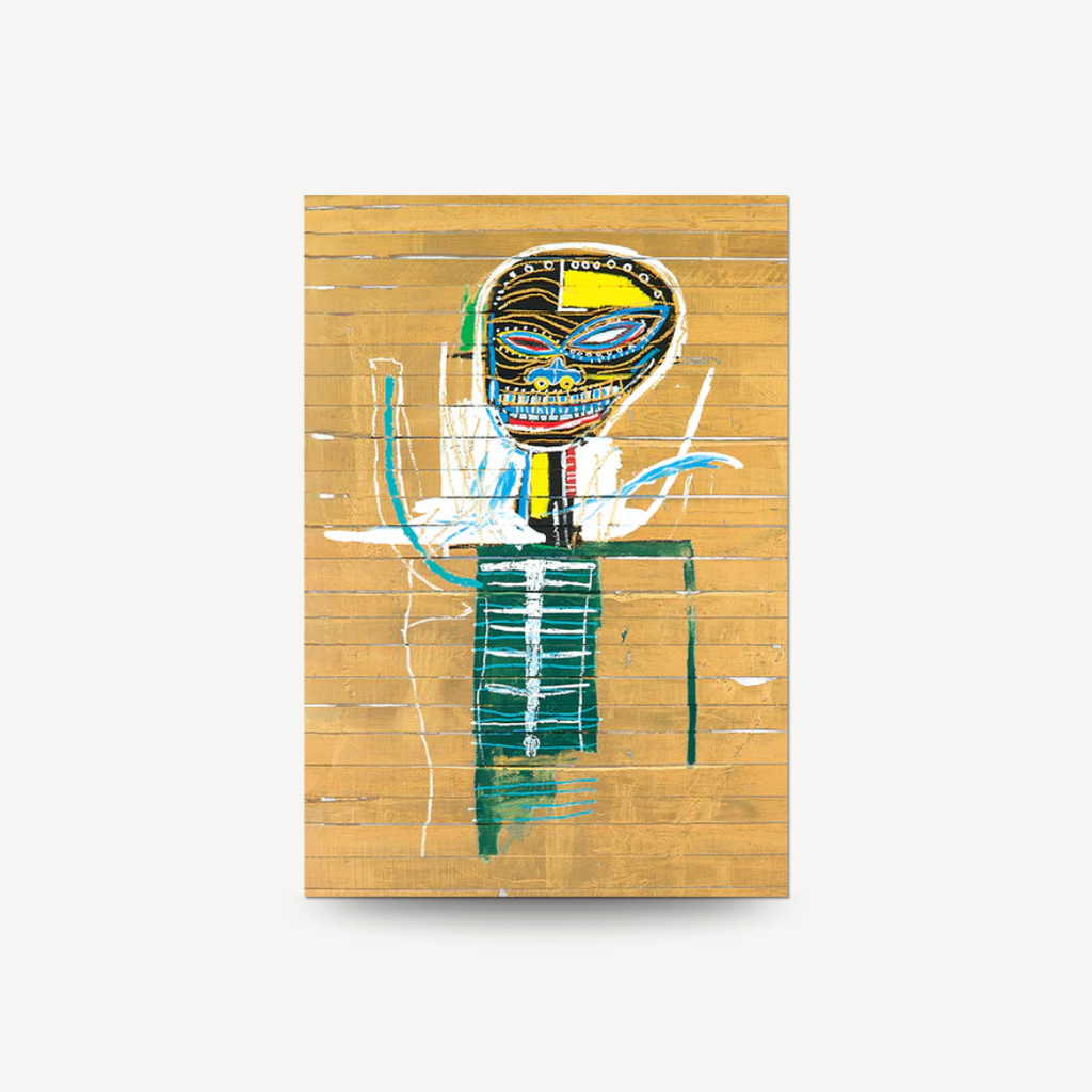 Gold Griot, 1984: This artwork is titled after West African storytellers, called griots, and pulls inspiration from traditional African idols and masks. • One premium metallic die-cut vinyl sticker. © Estate of Jean-Michel Basquiat. Licensed by Artestar, New York