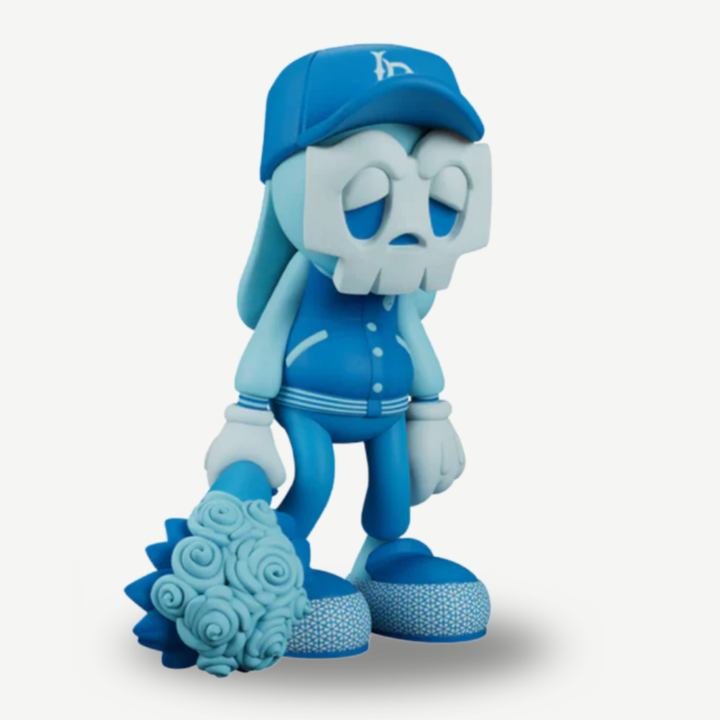 With his desperate look and bouquet of flowers that won't find a recipient, this vinyl figure wears a Long Beach brand cap and a cleverly matching baseball jacket. Behind the famous mask of Guggimon, we find a broken character whose only wish is to find love.