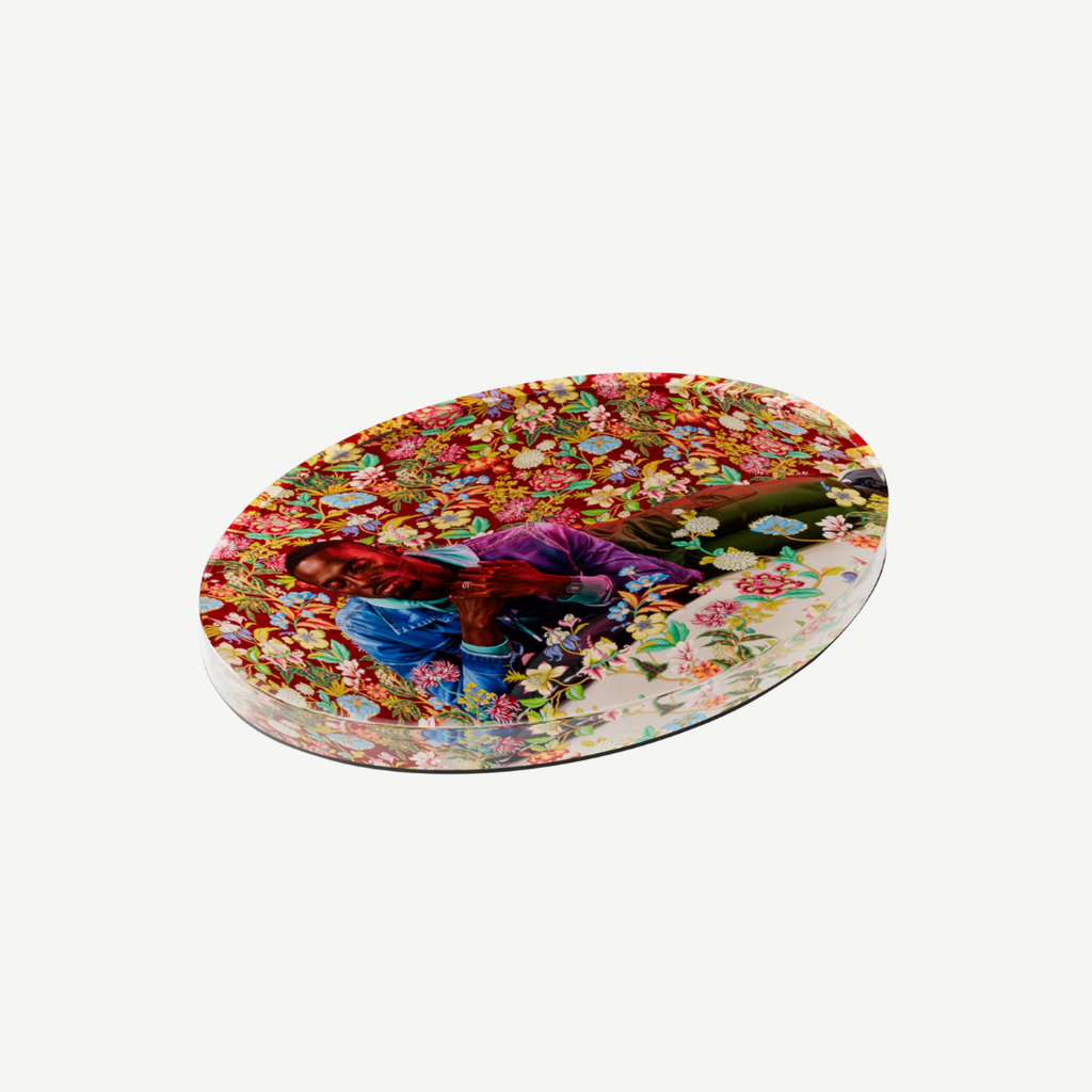 This oval lucite magnet features Kehinde Wiley’s 2022 painting titled Christian Martyr Tarcisius (El Hadji Malick Gueye), first exhibited in Kehinde Wiley: An Archaeology of Silence at Foundazione Giorgio Cini as a collateral event of the 59th international art exhibition – La Biennale di Venezia.