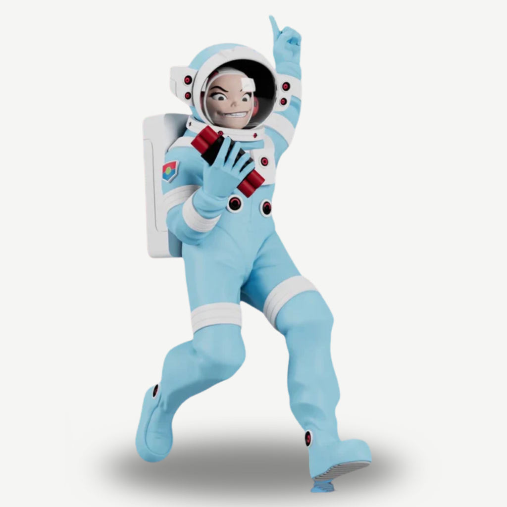 Inspired by the ’Strange Timez’ Gorlliaz episode, Astronaut Noodle is ready for take off in 12-limited-inches of SUPERPLASTIC soft vinyl. This exclusive art toy is complete with a blue spacesuit, jetpack, light-up eyes, and a gravity-defying display case. Limited quantities made.