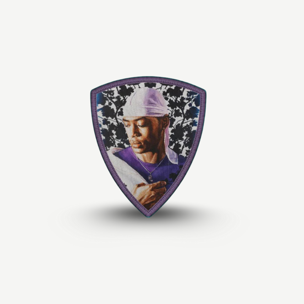 Ce patch en forme de bouclier de 8,3 x 10 cm représente le tableau de Kehinde Wiley, Étude du Tombeau du Pape Alexandre VII, peint en 2016. Un fond floral monochrome entoure le modèle et apparaît au premier plan. Le sujet détourne le regard du spectateur, contrairement à la plupart des œuvres de Wiley.