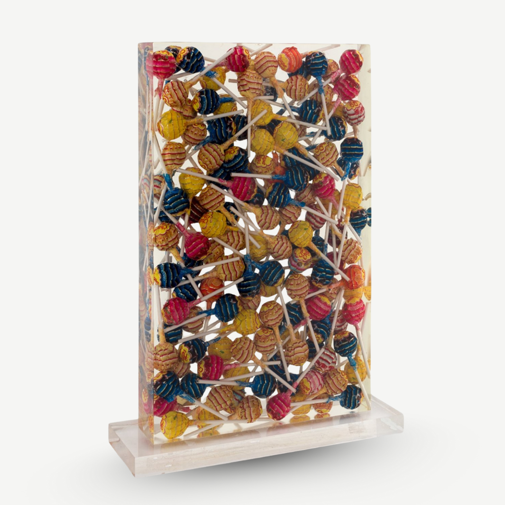 Signed ‘Arman’ and numbered on a label floating between the lollipops